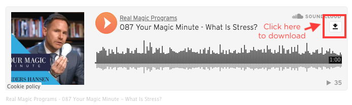 On each of the audio players, you’ll find a download icon in the upper right hand corner. Just select the audio you wish to download, then click the download icon to save the MP3 file to your device.